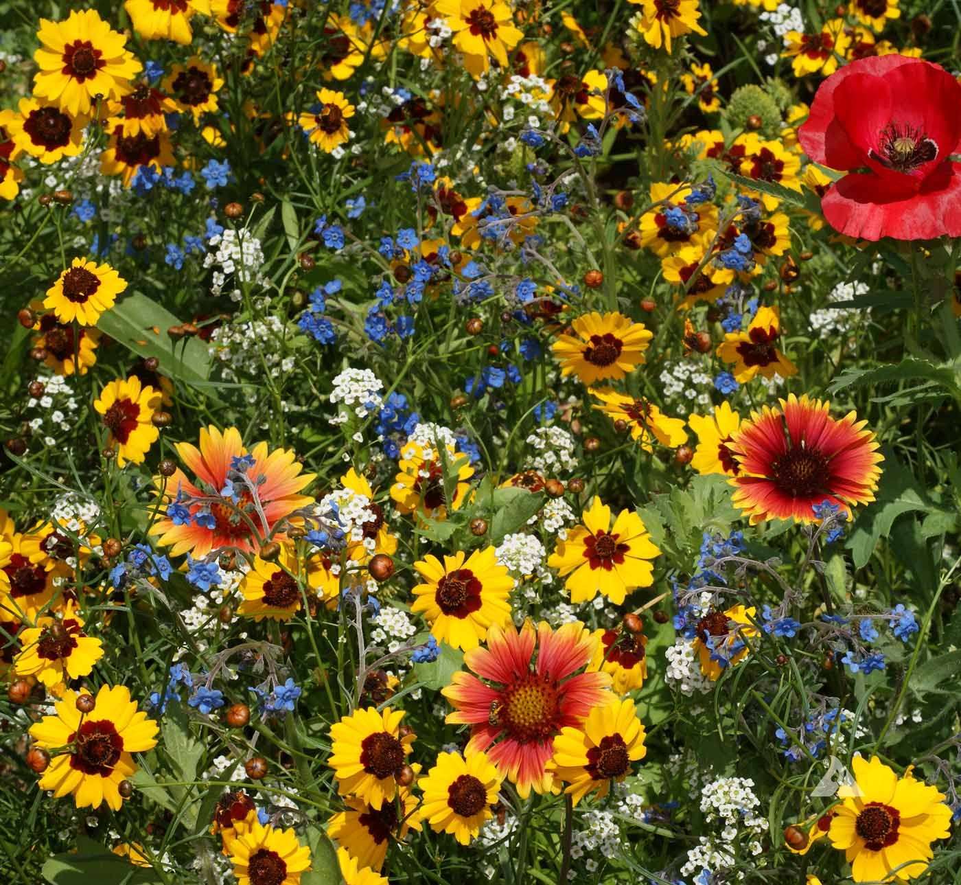 Baby Blue Eyes, Bergamot, Blue Flax, California Poppy, China Aster, Chinese Forget-Me-Not, Corn Poppy, Fleabane Daisy, Globe Gilia, Indian Blanket, Lance-Leaved Coreopsis, Lavender Hyssop, New England Aster, Plains Coreopsis, Purple Coneflower, Siberian Wallflower, Sweet Alyssum and Tidy Tips.