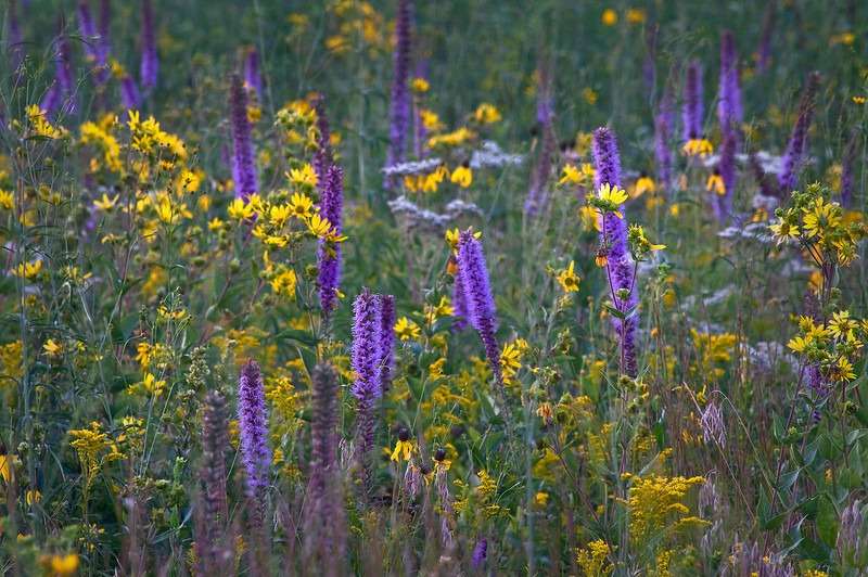 Wild Bergamot, Black-Eyed Susan, Blanketflower, Butterfly Milkweed, Dwarf Evening Primrose, Eastern Columbine, Gayfeather, Gray-Headed Coneflower, Lance-Leaved Coreopsis, Lavender Hyssop, Lewis Flax, Mexican Hat, New England Aster, Ohio Spiderwort, Perennial Lupine, Prairie Coneflower, Purple Coneflower, Rocky Mountain Penstemon and White Upland Aster.