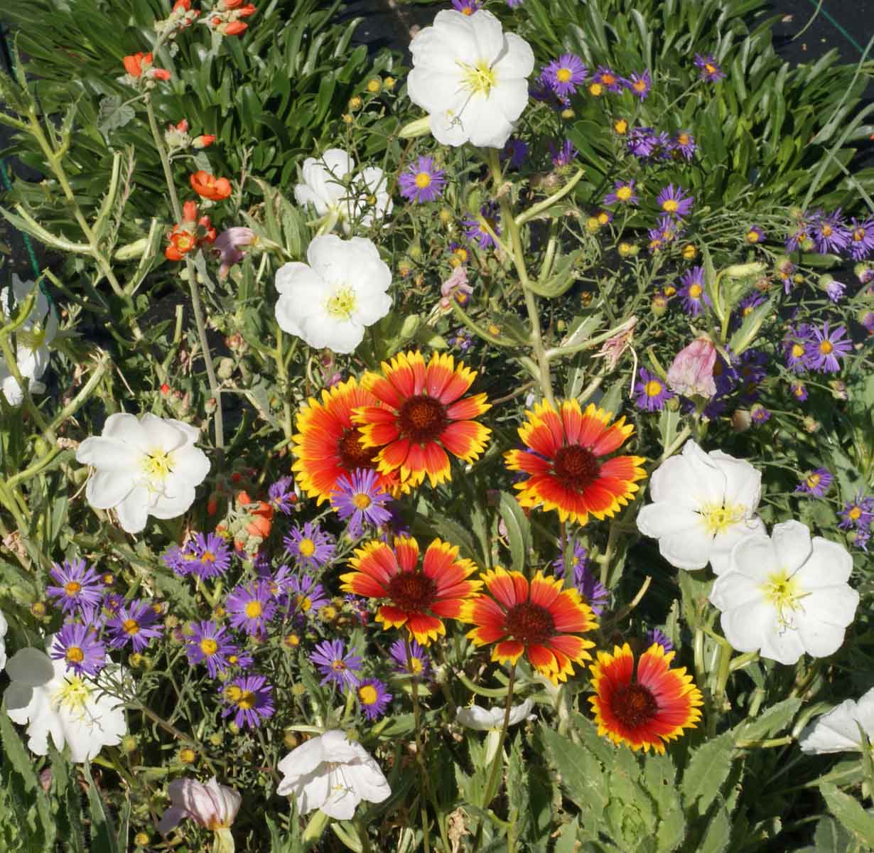 Arroyo Lupine, Bird’s Eyes, Blanketflower, Blazing Star, Blue Flax, California Bluebell, California Poppy, Deerhorn Clarkia, Desert Marigold, Gooseberryleaf Globemallow, Greenthread, Oregon Sunshine, Pale Evening Primrose, Palmer Penstemon, Prairie Aster, Prairie Coneflower, Rocky Mountain Penstemon and Tidy Tips.